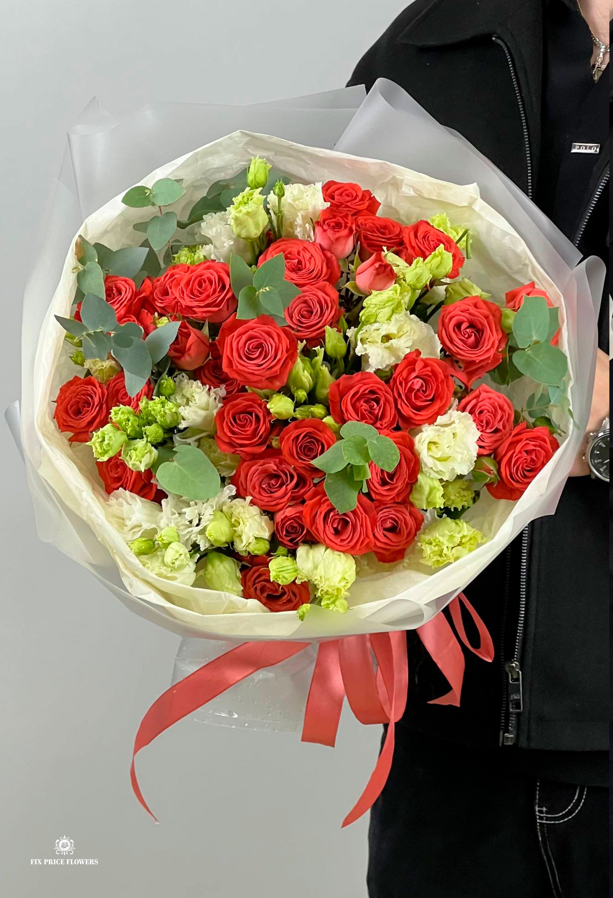Букет из кустовых роз, лизиантусов и эвакалипта - 22 шт