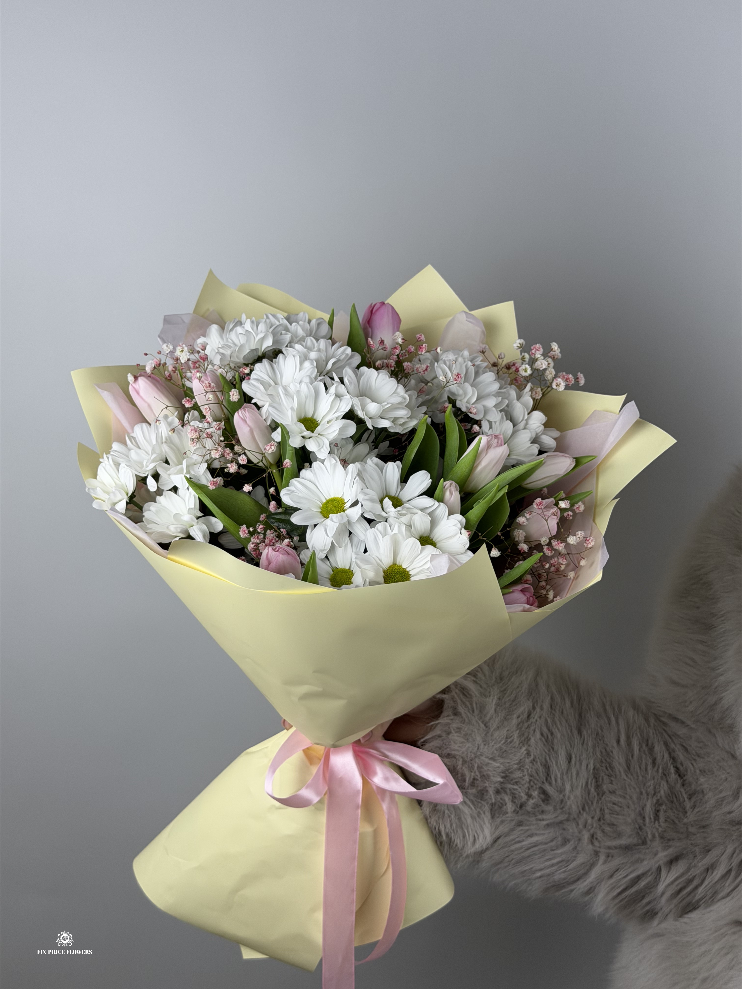 Букет из тюльпанов, хризантем и гипсофилы - 17 шт в Нижнем Новгороде