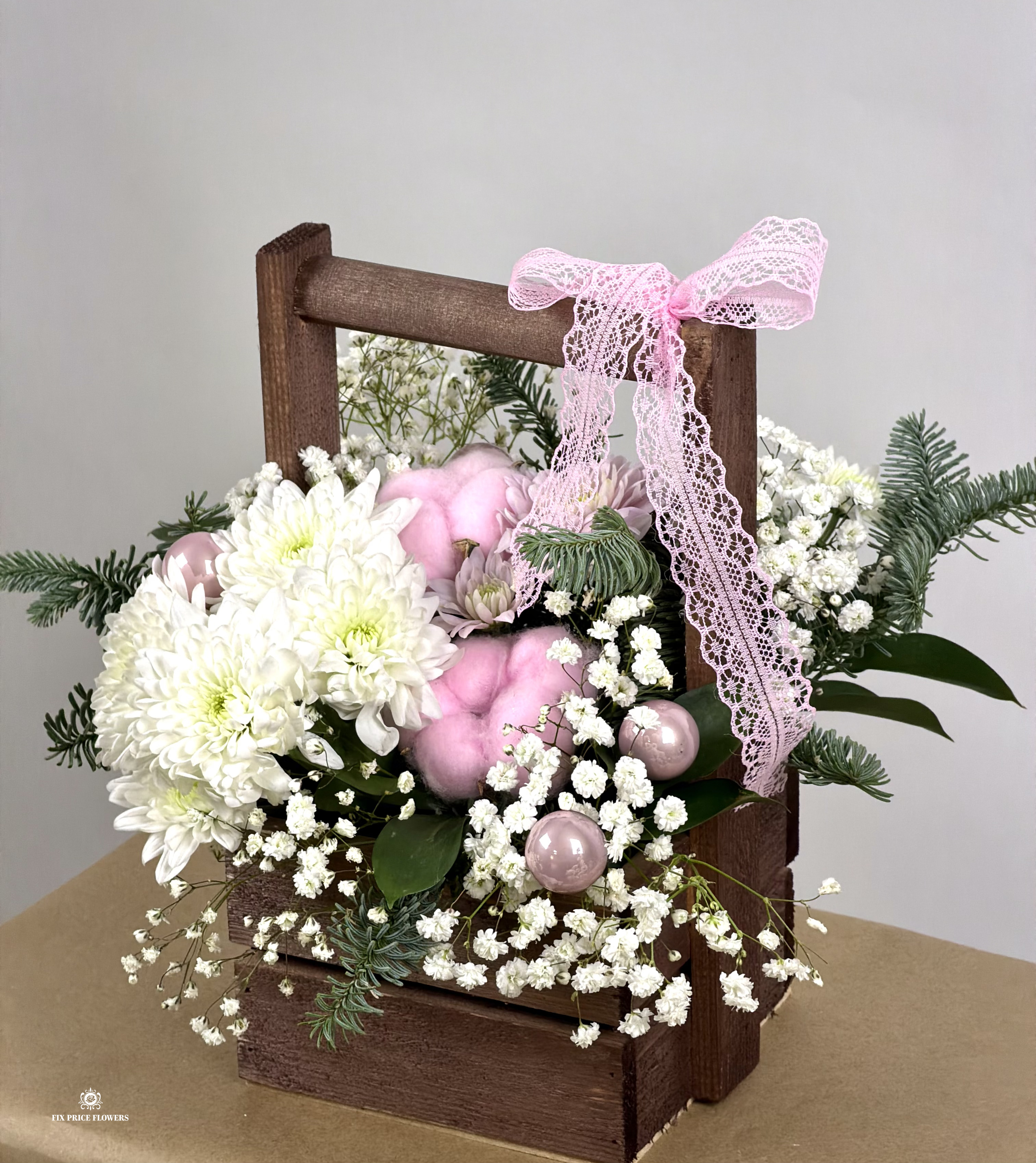 Новогодняя композиция из нобилиса, хлопка и хризантемы